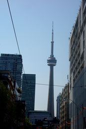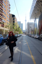 | Am frühen Vormittag fahren wir bequem mit der rot-weissen Tram Richtung Kensington Market und spazieren bei strahlendem Sonnenschein ein paar Meter zur OCAD University, wo mich die liebe Pat vor Torontos Wahrzeichen, dem CN Tower (berühmter Turm mit Drehrestaurant) fotografiert. |