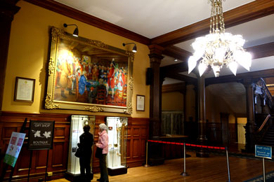 | Weil es gerade zeitlich perfekt passt, sehen Pat und ich uns die Führung zu Szenen der in Kanada bekannten Murdock-TV-Serie an, die hier gedreht wurde und bei der es einen "Tod auf grünem Teppich" gab. Kaum zu glauben, dass ich heute abend von Toronto nach München fliege! |