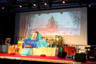 ![]() Die Bühne ist für Swami Vishwananda geschmückt |