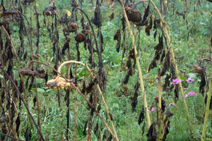 ![]() Rechts vom abgeblühten Sonnenblumenfeld liegt Biberkor |