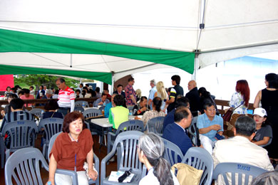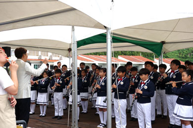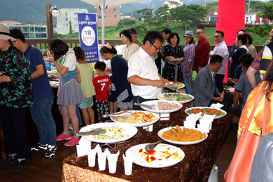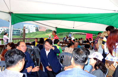 habe ich ausserhalb Südkoreas noch nicht gesehen. Auf der Terrasse ist nicht nur für das leibliche Wohl mit meterlangem Buffet gesorgt. Auch hier gibt es musikalisches Programm und Tänzerinnen. Einziger Wermutstropfen: Die herannahenden Hurrikane schicken ihre Boten voraus und es regnet leicht... |