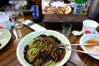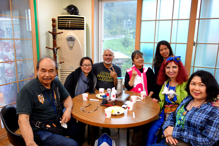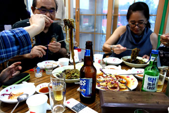 | Nach soviel Koreanischer Geschichtskunde ist unsere Künstlergruppe vom lieben Cheon Eob Yu (Museumsdirektor) in ein kleines koreanisches Restaurant eingeladen. Wir speisen hier an Tischen und Stühlen und nicht am Boden sitzend an kleinen Tischchen. Das Essen (für mich wieder vegetarisch) schmeckt wunderbar. Gut, dass ich mit Stäbchen essen geübt bin, denn in Korea isst man mit dünnen Metall-Stäbchen, was die Sache nocheinmal "verschärft". Metall ist leichter zu reinigen als Holzstäbchen. Deshalb musste ich vor 'zig Jahren bei meiner China-Reise eigene Stäbchen mitbringen, die ich dann - aus hygienischen Gründen - im Restaurant benutzte. Bestens gestärkt fahren wir zurück zu unserem schönen Haegeumgang Theme Museum. |
