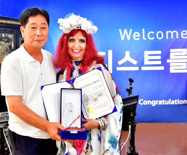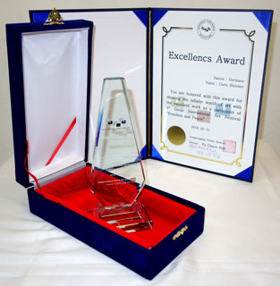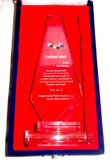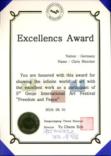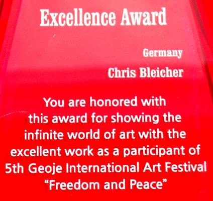 insbesondere den beiden Direktoren - wir waren eine grosse, internationale Familie! Die Bedeutung dieses Events wird klar, wenn man sich die im Vorspann des Kataloges involvierten Personen: hier sowie die Sponsorenfirmen: hier ansieht. Beteiligt waren 127 KünstlerInnen aus 35 Nationen: hier Aus Deutschland nahmen insgesamt 7 KünstlerInnen teil, wobei ich - alleine - Deutschland in Südkorea vertrat. Dass ich von den 127 teilnehmenden KünstlerInnen unter den 6 Besten bin und einen Preis bekomme, hätte ich nicht erwartet! Die PreisträgerInnen wurden von einer 5köpfigen Jury ausgewählt. Wobei zu berücksichtigen ist, dass die Südkoreaner ässerst strikt und korrekt sind, nicht vergleichbar mit anderen Ländern, wurde mir gesagt! Somit ist dieser von mir gewonnene Preis für meine weitere künstlerische Karriere sehr wertvoll. An dieser Stelle möchte ich mich auch bei meinen jahrelangen Bleicher-SammlerInnen bedanken, die mich durch den Erwerb von Bleicher-Art unterstützten und u.a. auch unter dem Aspekt des Wertzuwachses erwerben, denn: Wenn ein Künstler von Kunst lebt, ist "Kunst verkaufen" wichtig, um weiterarbeiten zu können... Leider wurde am 23. September das schöne Haegeumgang Theme Museum katastrophal durch Taifun zerstört! Bitte spendet, jeder Euro zählt! Info hier Fotos bzgl. Schaden: hier |