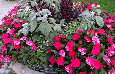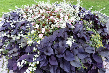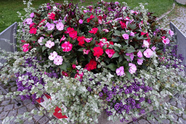 bepflanzten Blumenarrangements. Es ist eine Freude, um den Baum herum von Topf zu Topf zu spazieren und