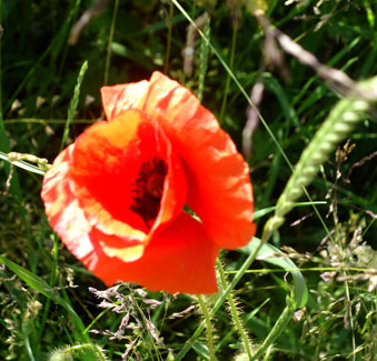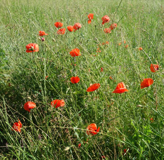 Ein Teil des Ackers ist unbewirtschaftet. R.oter Klatschmohn leuchtet zwischen hohem Gras als Farbtupfer . Etwas