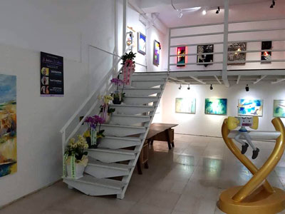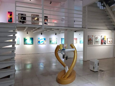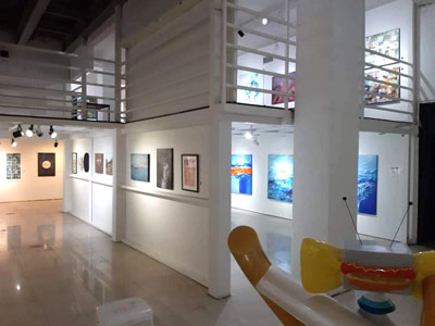 Im Foyer der Ausstellung sieht man meine Neon Art schon von unten leuchten.