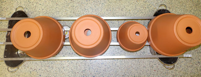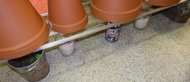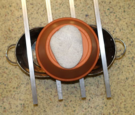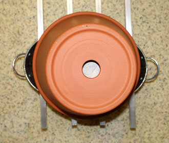 The hole in the small clay pot below is closed with a stone, the upper clay pot has an open hole for air extraction.