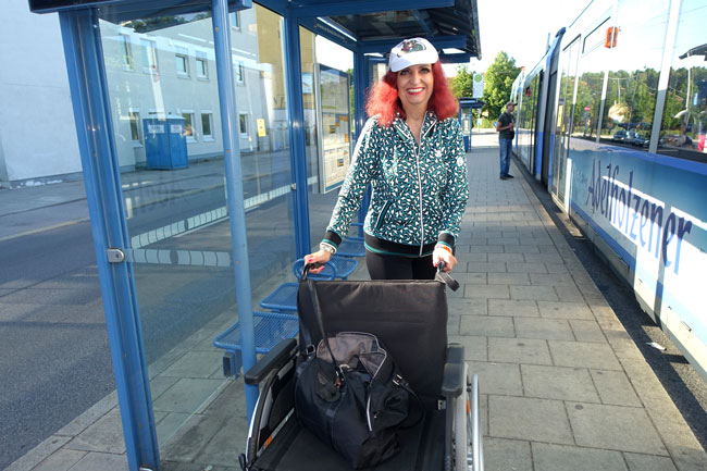 Zwei junge Männer helfen mir mit dem Ungetüm in die Strassenbahn.