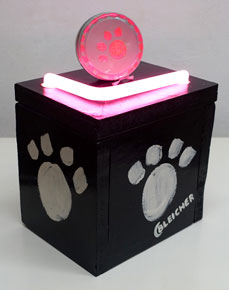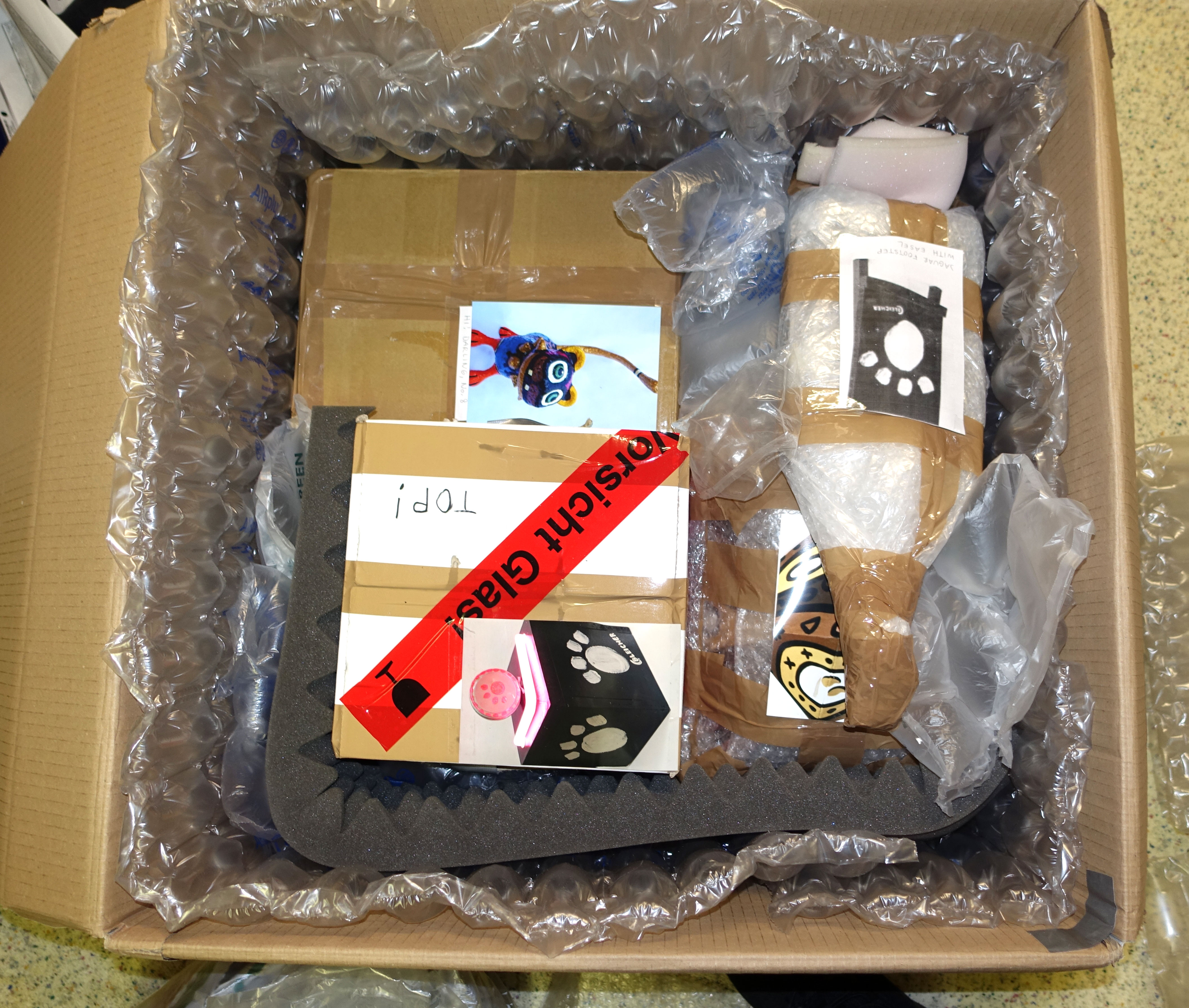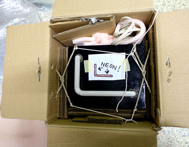 Diverse kleinformatige Bleicher-Art wird einzeln verpackt und teilweise mit Karton als Stoßdämpfer ummantelt, was sich erfahrungsgemäss als effektiv erwies. Es ist erstmalig, dass ich es riskiere, eine Mini-Neoninstallation per DHL nicht nur zu versenden, sondern um die halbe Welt zu verschicken: Das Neonteil sitzt fest, ist klein und muss nur von oben gesichert werden, sollte das Paket auf den Kopf gestellt werden oder das Flugzeug in ein Luftloch gelangen, wo alles dadurch nach oben driftet. Deshalb zurre ich es mit Paketschnüren am Karton fest und hoffe, dass meine aufwändige Verpackungstechnik Erfolg hat?