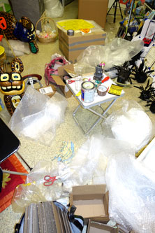 Das Verpackungschaos ist in vollem Gange. Etwas Besonderes muss ich mir einfallen lassen, um meine 6 Raben transportgerecht verpacken zu können: Ihre original Rabenfedern stehen in alle Richtungen und sollen heil im Museum in Südkorea ankommen. Es reicht nicht, sie einfach in eine Schachtel zu setzen, denn sollte das Paket seitlich oder kopfüber um die halbe Welt reisen, würde das den Federn schaden.
