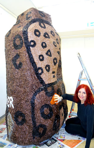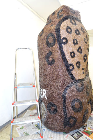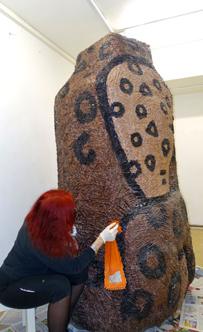 Nach 27 Jahren bewegtem Jaguar-Leben erhält der "Kleine" einen neuen Farbanstrich. Deshalb reinige ich den Riesenjaguar mit einem feuchten Wischmopplappen, der Fransen hat, nach dem Motto "Wasch' mich, aber mach' mich nicht nass!". Das ist teilweise sportlich, denn es geht Leiter rauf, Leiter runter. Obwohl das "Tierchen" im Vorraum von Professor Wiesner im Verwaltungsgebäude vom Münchner Tierpark Hellabrunn prallem Sonnenlicht viele Jahre ausgesetzt war, hat die Farbe, die zum Vorschein kommt, noch immer erstaunliche Leuchtkraft. Klar, denn ich arbeite immer mit besten Materialien.