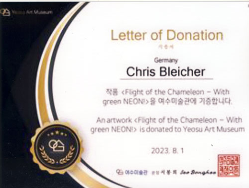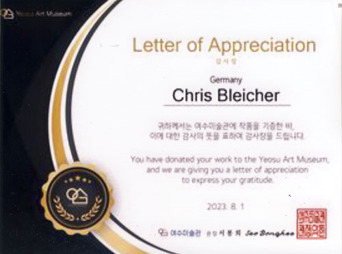 Anlässlich der aussergewöhnlichen Spende meines Kunstwerkes vom Haegeumgang Theme Museum an das Yeosu Museum of Art hier erhielt ich vom Yeosu Museum of Art Dankesbrief und Spendenurkunde.