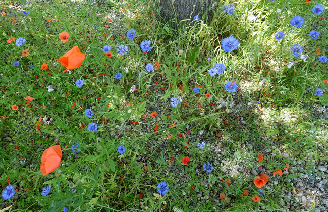 elcsodálkozom: az Edelweißplatzon dúsan no a piros pipacs és a kék búzavirág.