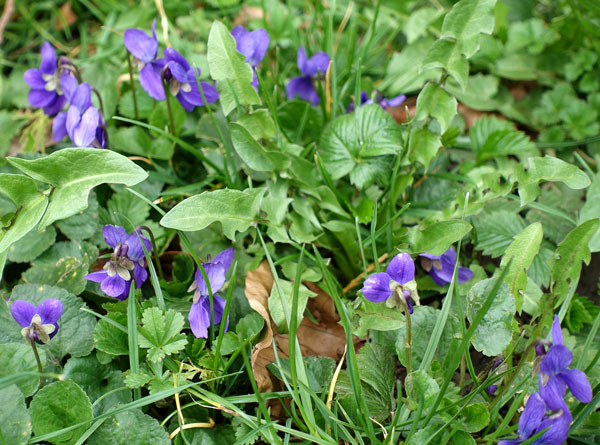 Duftende Veilchen wetteifern mit Gänseblümchen auf dem Weg zur U-Bahn. Beide wachsen getrennt an verschiedenen Stellen.