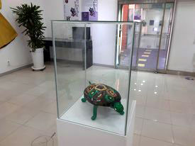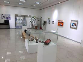 In der Mitte des Raumes sind meine Kunstwerke in Vitrinen.