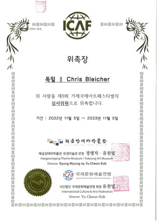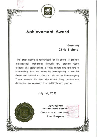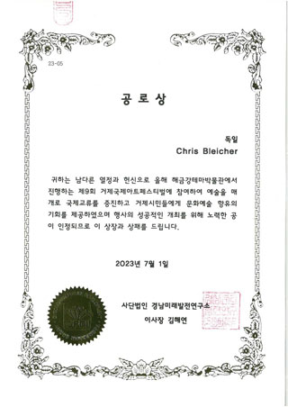 Von den 20 Jurymitgliedern des 9. Geoje International Art Festivals des Haegeumgang Theme Museums in Südkorea erhalten einige Ausgewählte, zu denen ich auch gehöre, eine Auszeichnung für unsere Leistung. Diese Wertschätzung für unsere harte Arbeit freut uns sehr.