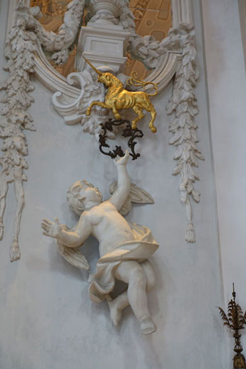 Ob das Einhorn nur ein Fabelwesen, ein Sumatra- oder Java-Nashorn oder eine andere Tierart ist, darüber gehen die Meinungen auseinander. Egal, es sieht hübsch aus und ist das Wappentier des Hauses Borromeo.