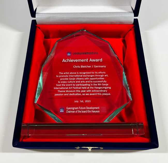 Einige der Jurymitglieder erhielten diese Auszeichnung und es freut mich sehr, dass ich dabei bin. Das Haegeumgang Theme Museum in Geoje, Südkorea schreibt, frei übersetzt: Zitatanfang: "Die folgenden Juroren wurden vom Gyeongnam Future Development Institute (= Zukunftsentwicklungs Institut) mit einer Plakette und einer Würdigung ausgezeichnet für die Leitung dieses künstlerischen und kulturellen Austauschs in ihren Ländern. Herzlichen Glückwunsch vom Museum an Sie alle für Ihre Arbeit." Zitatende