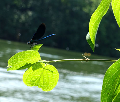 mich auf die Stufen, teste die Wassertemperatur und beobachte eine blaue Libelle