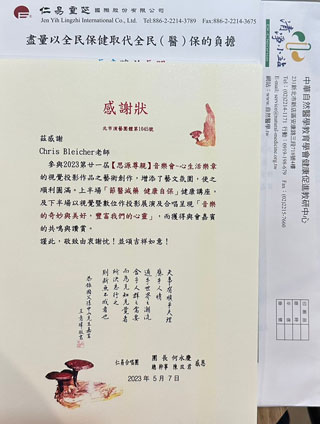 Zwei Bleicher-Kunstwerke wurden anlässlich des Konzerts der Wertschätzung 2023 in Taipeh in Taiwan präsentiert. Mein grosses Dankeschön geht an die Kuratorin Anasha Anasha und die WCECA Organisation hier, die meine Kunstwerke dafür auswählte und mir heute diese schöne Nachricht übermittelte. Umso mehr freut es mich, das meine Kunstwerke in diesem positiven energetischen Rahmen mit exzellenten Künstlern gezeigt werden. Da meine zwei Werke diesmal nicht physisch vor Ort sind, sind sie als Fotos zu sehen. Zitatanfang: "Danke an Professor Xie von der Xuanghu University (CEO der Stiftung) - HeartLebenKunstKulturStiftung 5 5/7 mit moderiert vom SiyuanZunZunKonzert im Nanhai Theatre; der Vorstand von WCECA World Association of Culture, Creative, Economic and Trade unterstützte spontan insgesamt 28 Aussteller, 39 Werke. 2023 Siyuan Konzert - HerzLebenMusik Zitatanfang: „Es gibt nur eine Mutter Erde für den Menschen. Deshalb müssen wir alle in der menschlichen Gesellschaft in Frieden und Mitgefühl füreinander leben.“ Die Harmonie der Musik ist die Resonanz positiver Gedanken, positiver Botschaften und positiver Energie, und das Singen im Chor kann ein Energiefeld voller harmonischer Botschaften bilden, die die Selbstheilungsf&aumml;higkeit stärken. Das Anerkennungskonzert 2023 wird erneut mit Dankbarkeit und Segen, mit guten Kenntnissen über Gesundheit und Krankheitsprävention und mit Liedern zum Beten abgehalten Gemeinsam für den Frieden über die Taiwanstraße und weltweit.“ Ende des Zitats Konzert mit Track Titel und Künstler siehe nächste peepart Tagebuch Seite.