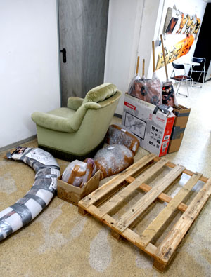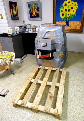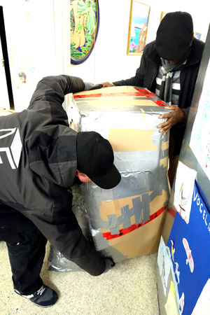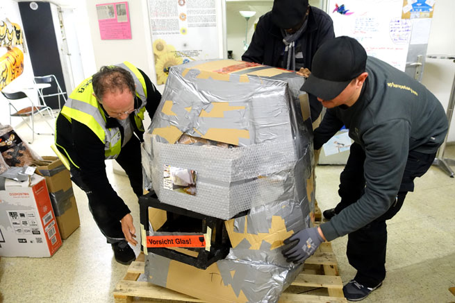 Grosstransporte sind abenteuerlich: In diesem Fall passst der verpackte Kopf nicht durch die Türe! Doch mit Geduld wird er gedreht und gewendet und hurrah, er hat es geschafft, ohne dass ich die Verpackung entfernen muss. Danke, liebes alpha trans / Anfang & Foster-Team!
