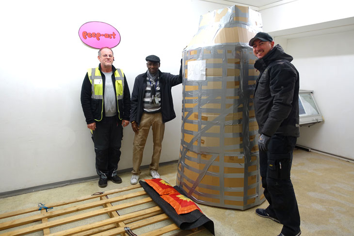 Heute ist er da, der grosse Tag: Die Abholung meines Riesenjaguars durch meine Transportfirma alpha trans, die u.a. auch meine original Starfighternase F-104 "Flower Power" sicher nach Busan in Südkorea transportierte, wo sie von den Museumsleuten in Empfang genommen wurde. Ein LKW + Fahrer, 2 Männer von alpha trans und 1 Mann von der Verpackungsfirma Anfang & Forster sind bei der heutigen Aktion mit von der Partie.