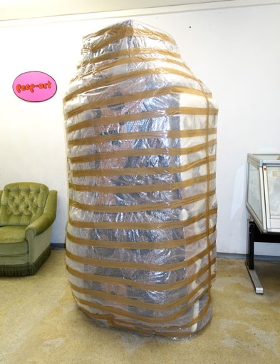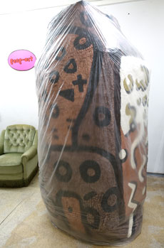 Für die lange Reise von München bis zum Haegeumgang Theme Museum benötigt das "Tierchen" eine gute Verpackung. Nach dem neuen Anstrich erhielt der Riesenjaguar "Das grosse Lächeln" bereits eine dünne Malerfolie. Über diese kommt nun Bubble-Folie und danach wird er mit Karton und viel Textilklebeband ummantelt, bevor er auf eine Palette gelegt wird.