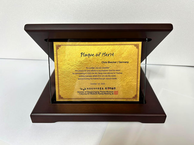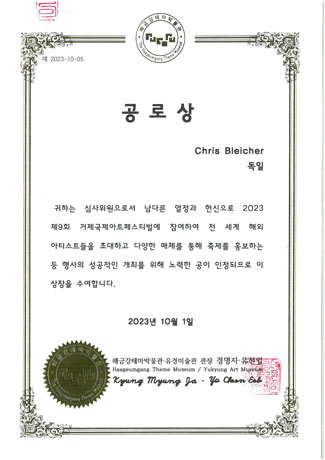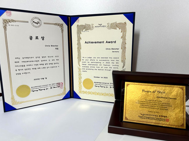 Kyung Myung JA (Yukyung Art Museum). Freie Übersetzung Zitatanfang: "Als Juror erhalten Sie diese Auszeichnung für Ihre Bemühungen, die Veranstaltung erfolgreich auszurichten, indem Sie im Jahr 2023 am 9. Geoje International Art Festival teilnehmen, ausländische Künstler aus der ganzen Welt einladen und das Festival über verschiedene Medien bewerben."