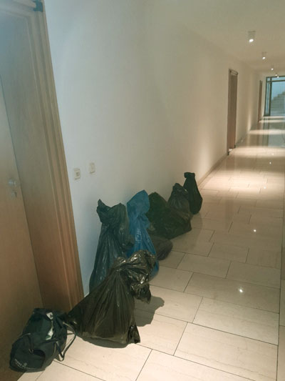 gewordene Pflanzen für den Transport in Mülltüten. Um hilfsbereiten