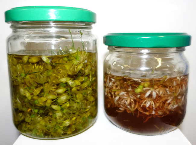 garlic flowers in vinegar and 1 jar where they are marinated in olive oil