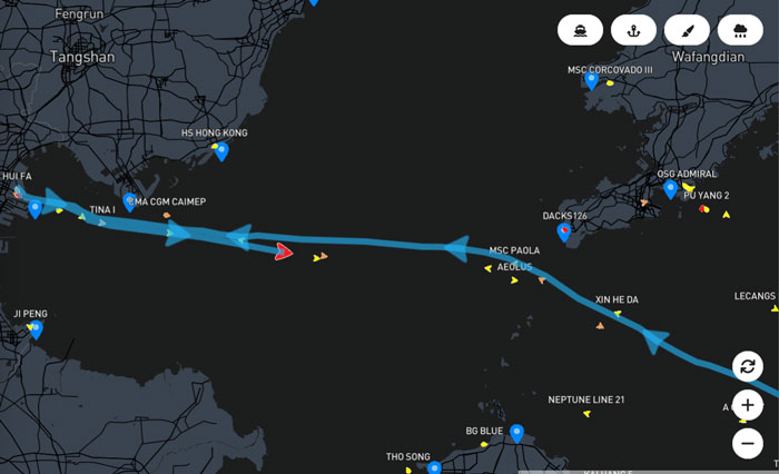 Free English translation After swerving to the left, the HMM Rotterdam heads east again towards South Korea.