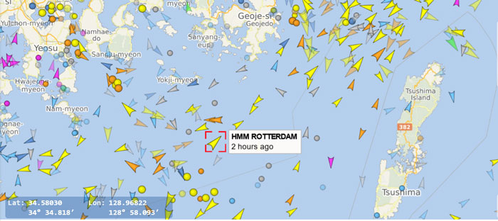 Two days later the HMM Rotterdam is already south of Geoje,