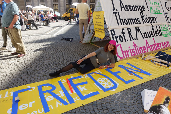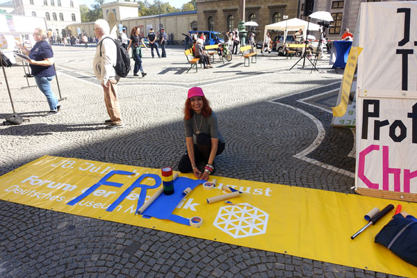 zeitkritische Kunst auf und ich ergänze das Banner mit weiteren FRIEDEN-Buchstaben.