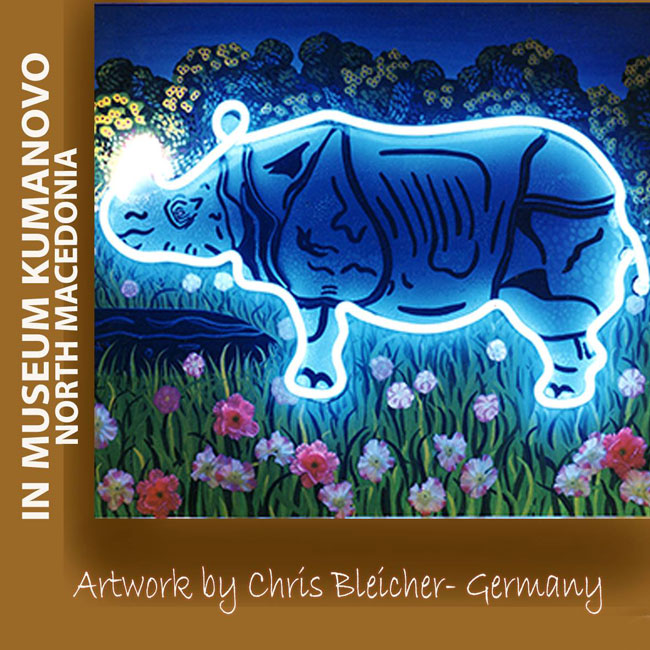 Druck meines "Rhinos in Sumpfblütenlandschaft" im Museum |