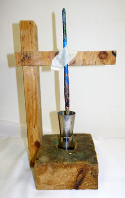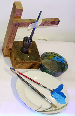 Gästen zu vermeiden. Das Schminktäschchen nähte ich selbst aus Stoff von einem Kleid, das ich 2019 in Südkorea trug: hier Es ist durch das verwendete Material leichter als ein Plastikteil und nachhaltig. Dazu finden sich Schminkutensilien, die ich bei mir trage, wenn ich unterwegs bin: Lippen- und Konturenstift, Kamm, Spiegel, Eyeliner. Und selbstverständlich dürfen gebrauchte Pinsel, ein Farbenmischteller, Behälter für Wasser sowie ein selbstgebauter "Pinsel-Galgen" zum Reinigen meiner Pinsel nicht im Bleicher-Memorial fehlen.