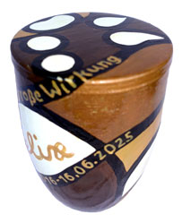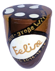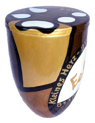 Golden Bronze with gold-colored lettering: Sounds simple, but combining the saying and dates in the relatively small space of the pet urn with the Golden Bronze motif was a challenge, because small gold lettering on a white or bronze background is difficult to read. But suddenly, I saw in my mind's eye how I could solve this task: on the black contours, which I would make a little wider for the lettering and date. Starry Sky This is an animal urn from my series; more motifs here