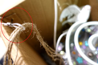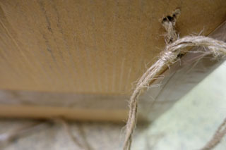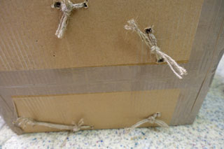 ![]() Die Schnüre werden auf der Unterseite des Kartons verknotet The strings are knotted on the bottom of the box |