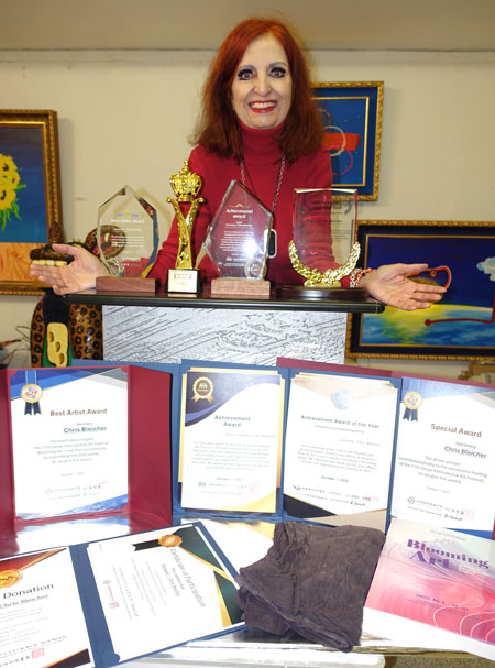 6 Zertifikate, einen Katalog und ein Tuch in meinen Ausstellungsräumen auf.