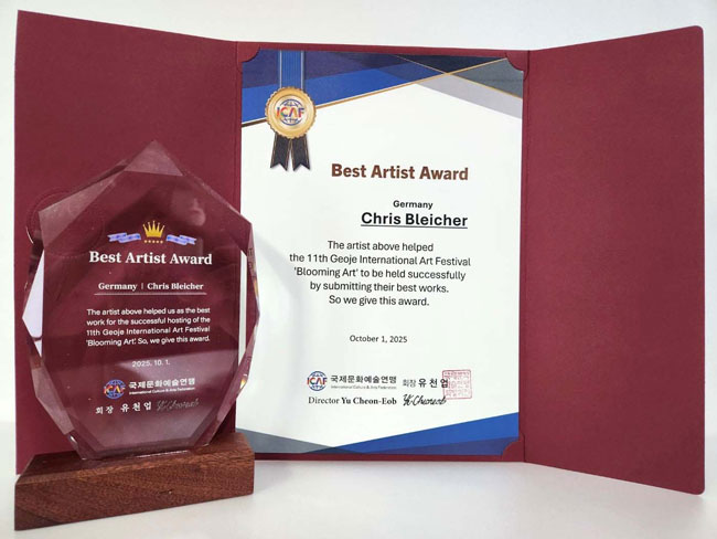 Jurymitglieder! Zitatanfang: "Der oben genannte Künstler hat durch die Einreichung seiner besten Werke zum Erfolg des 11. Internationalen Kunstfestivals Geoje "Blooming Art" beigetragen. Daher verleihen wir ihm diese Auszeichnung." Zitatende
