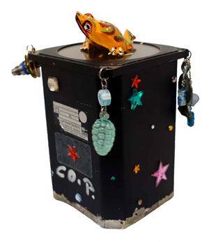 Flugzeugteil mit orangem Frosch Airplane Piece With Ornge Frog Mischtechnik mit Original-Flugzeugteil, orange Holzfrosch, Kollage Mixed Media with original airplane piece, orange wooden frog, collages |