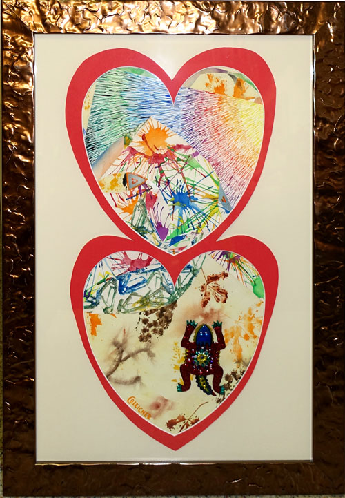 A Heart for a Heart Pinted collage (youth work), Metal figur from Mexiko, red passpartout cut in heart shape, metal frame 65 x 47 cm
