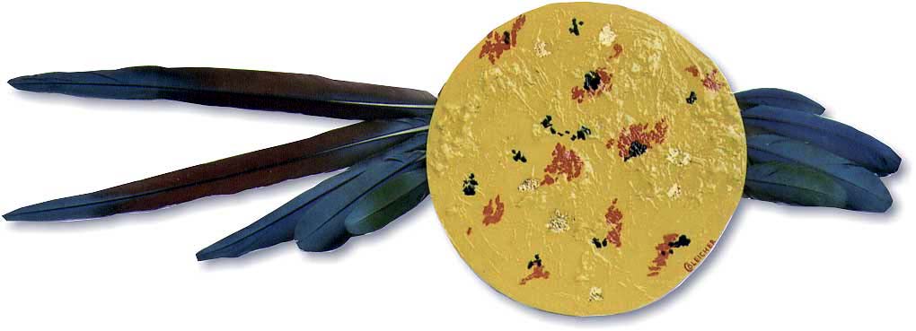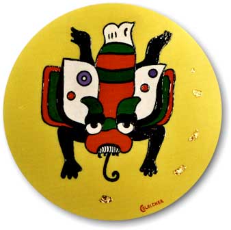 Mixed media, among others acrylic, The bee brings heavenly presents, and honey is the sacrificial offering for the highest Gods. Tears of the Sun God Re, which fell on earth, became working bees. |