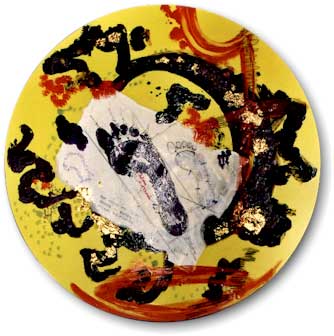 Mixed media, among others gold leaf and acrylic, Chris Bleicher immortalized herself with her "Footstep for Helios" painting, part of the neon wall installation "Colossus in Motion". Her footprint and the scetch where the bases of the draft.