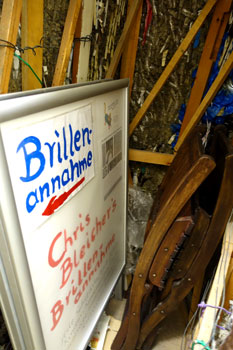 zwei Klappstühle, einen Plakatständer für meine Brillensammelaktion und