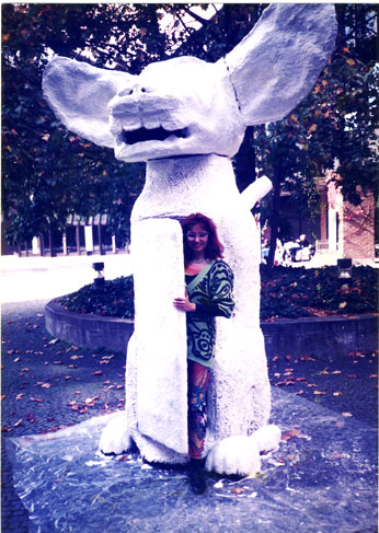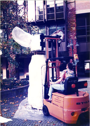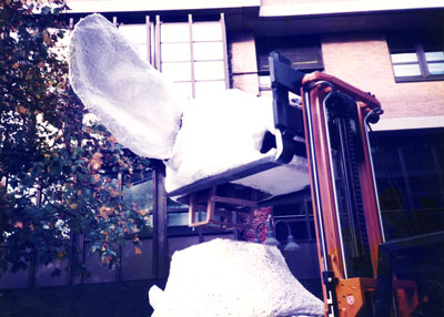 die Bemalung wird er per Gabelstapler umgesetzt.