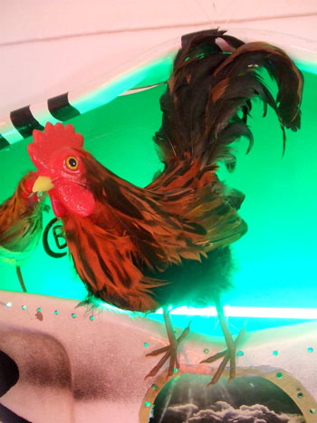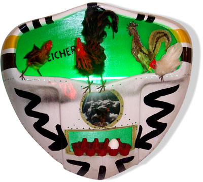 ![]() Das Huhn im Cockpit Mischtechnik, u.a. Original Flugzeugteil, grünes Neon auf Acryl, Blatt-Collage, Ei, Eierkarton 75 x 85 cm