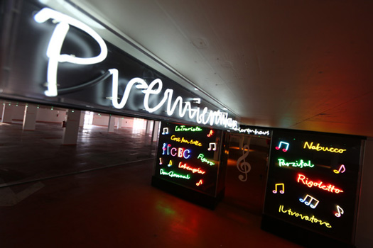 Der weisse Neon-Schriftzug "Premierenhaus" ist doppelseitig und auch eine Spezialanfertigung, die
