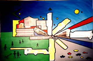 Big Shopping Für Besprechungsraum von Baufirma Neon Bild Objekt ohne Neon, mit collagierten Frontansichten von Bauplänen/ Frontansichten von Bauprojekten der Firma auf Acryl 100 cm x 150 cm |