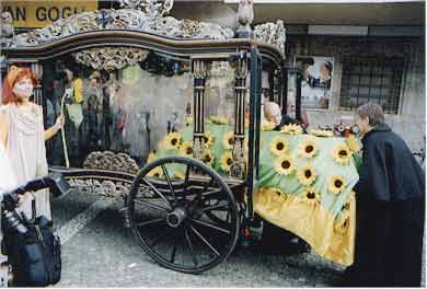 ![]() Der Einmarsch in das Forum der Technik erfolgt zusammen mit den Trauer- pardon Vernissage-Gästen; die meisten kamen mit Sonnenblumen